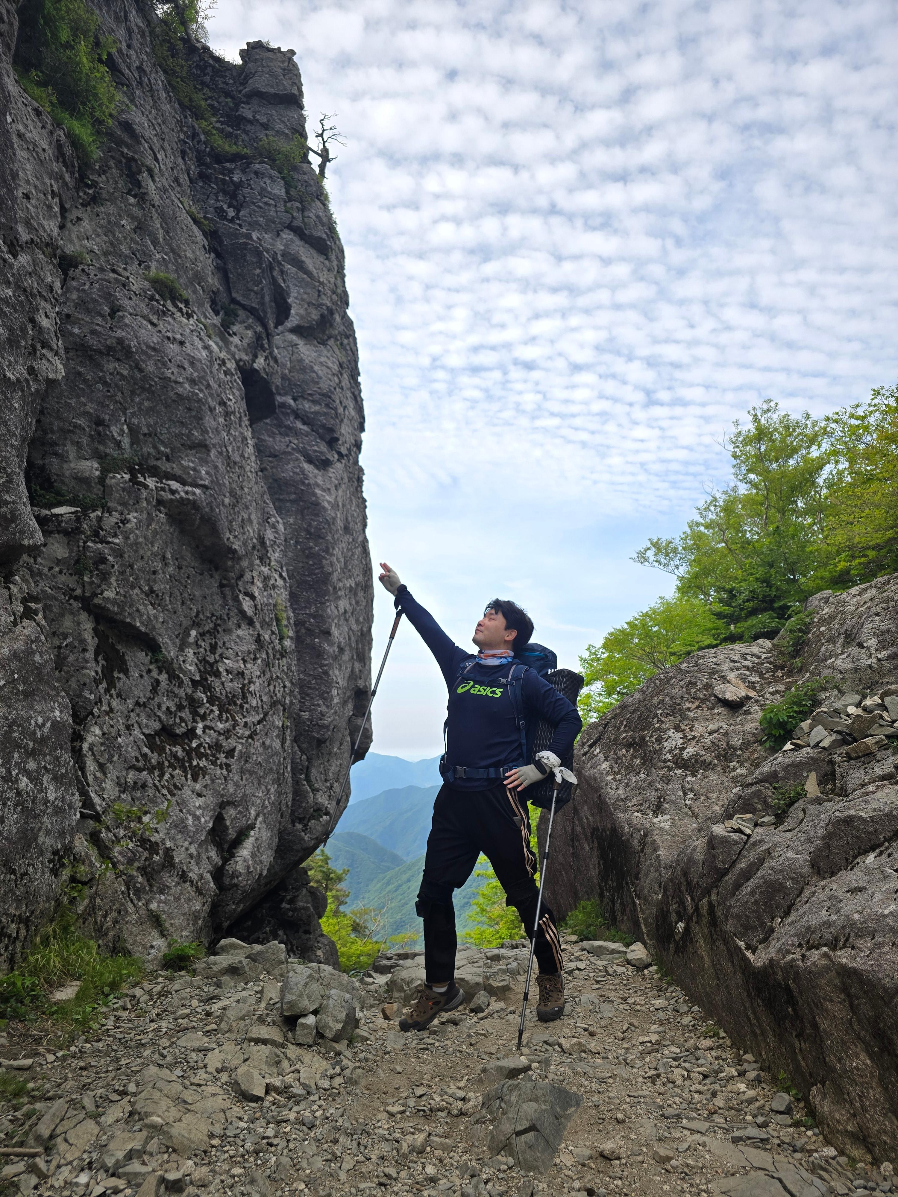중간쯤 쉬어가는 코스. 스틱으로 가리키는 곳이 천왕봉이다. 저곳까지 오늘 가야 하는데~~ 하는 두려움과 이제 절반정도 왔다는 행복감으로 남은 길을 걸어보자.