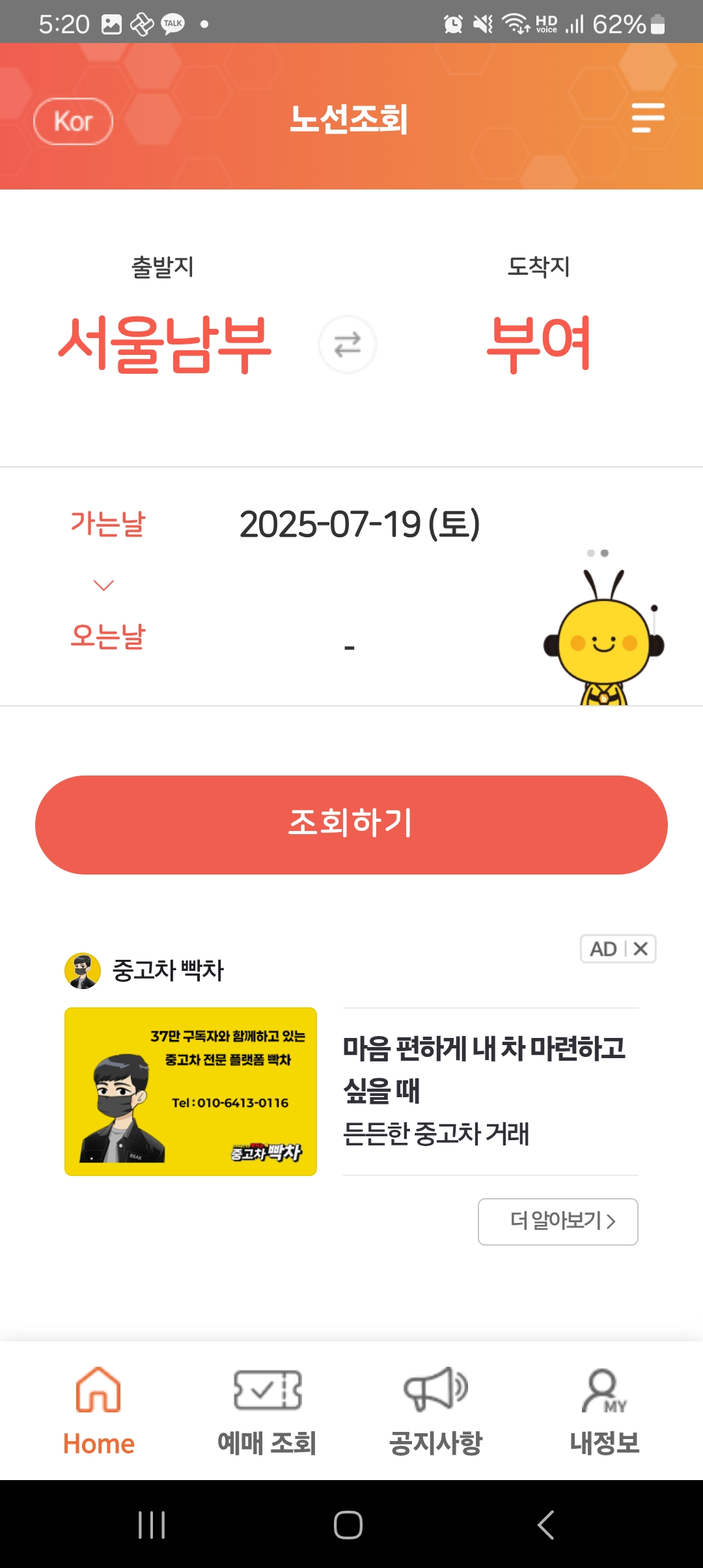 날짜를 선택해서 조회하면 시간대별로 버스가 표시되요. 시간이 1시간~1시간반 간격으로 있어서 부여가는데 큰 어려움이 없네요!