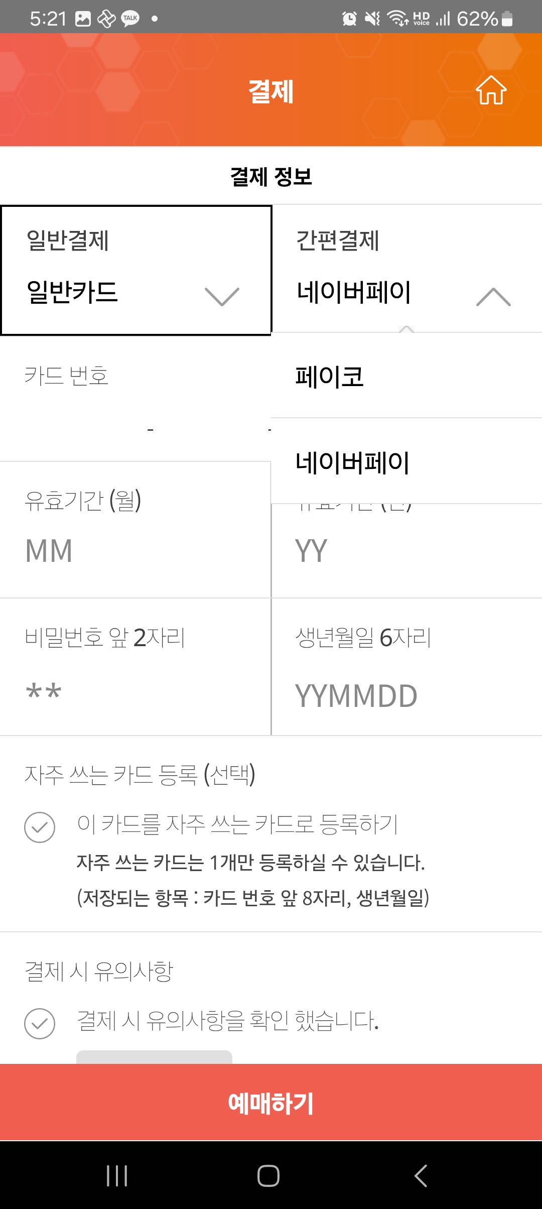예매 버튼 누르면 부도위약금 메시지가 나옵니다. 확인 후, 결제방식 선택. 해보시면 큰 어려움 없이 가능합니다.