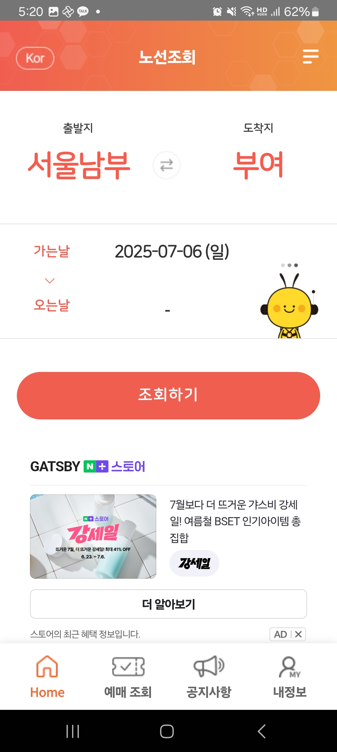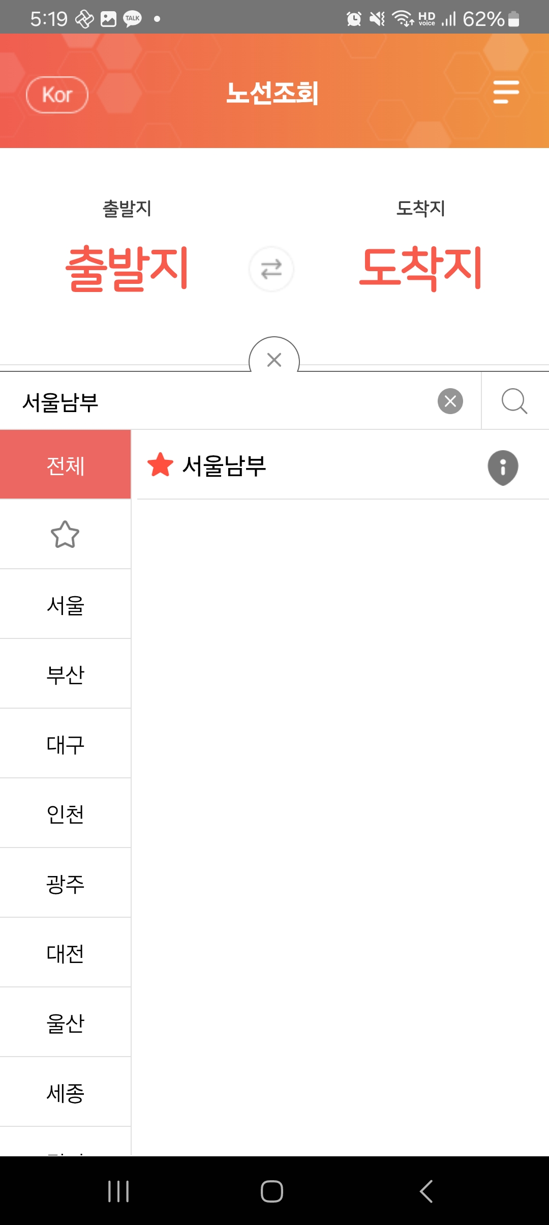 어플 실행하고 출발/도착/날짜를 입력합니다.
