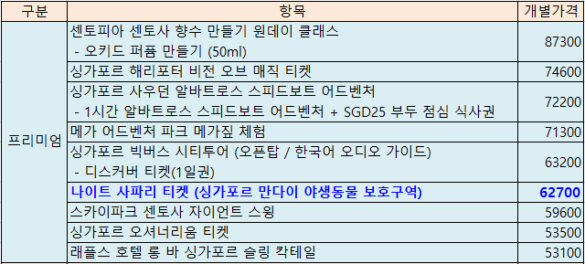 | 나이트 사파리 티켓 (싱가포르 만다이 야생동물 보호구역) | 62,700 | |