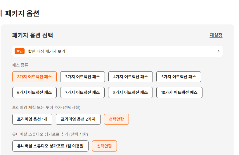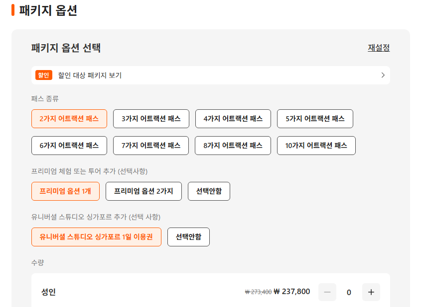 스탠다드 2종, 프리미엄 1종, 유니버셜 입장권 패스로 선택하니 237,800원이 나왔어요~